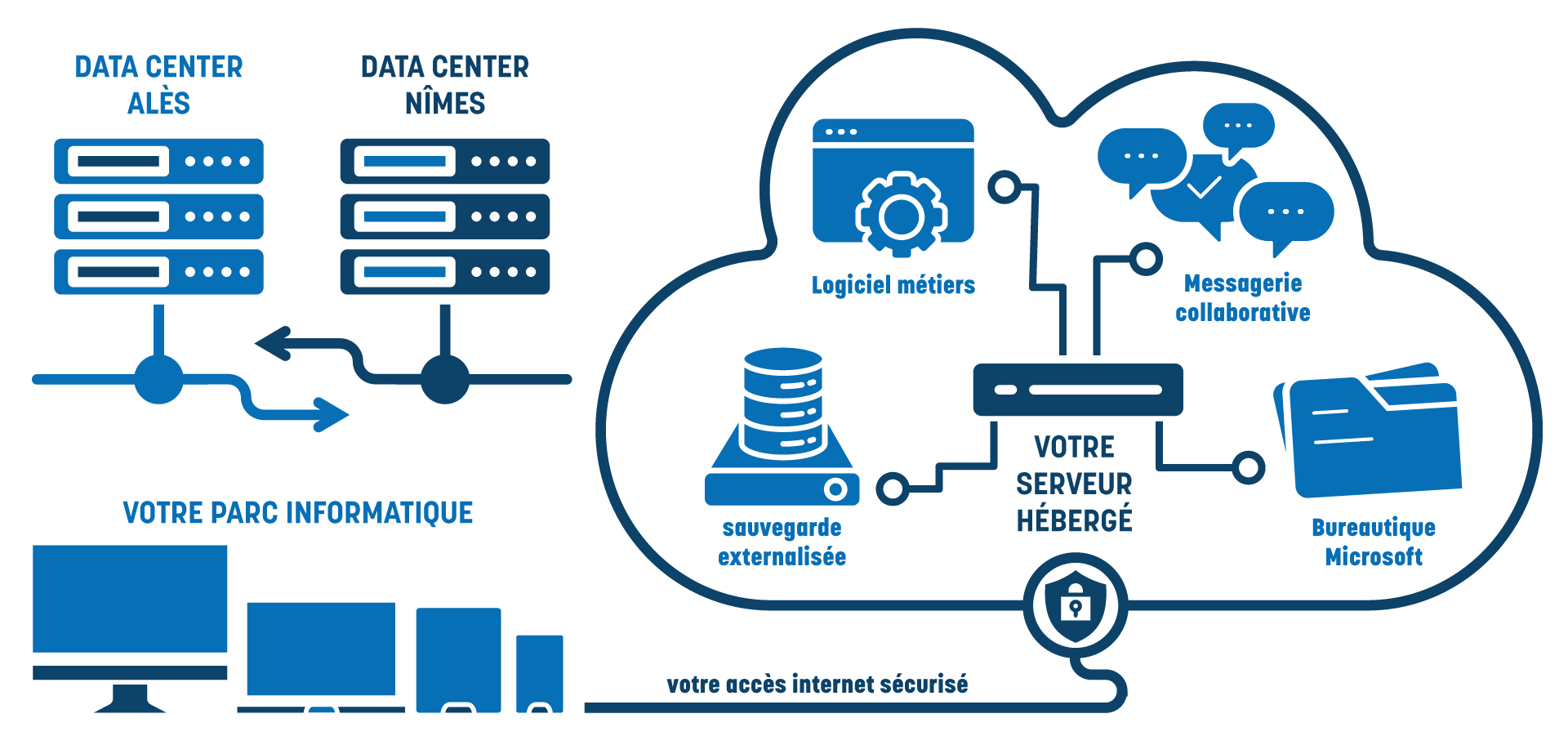 Notre offre de proximité a l’avantage d’être hébergée localement dans nos locaux d’Alès en redondance avec le datacenter de Nîmes NETICENTER.